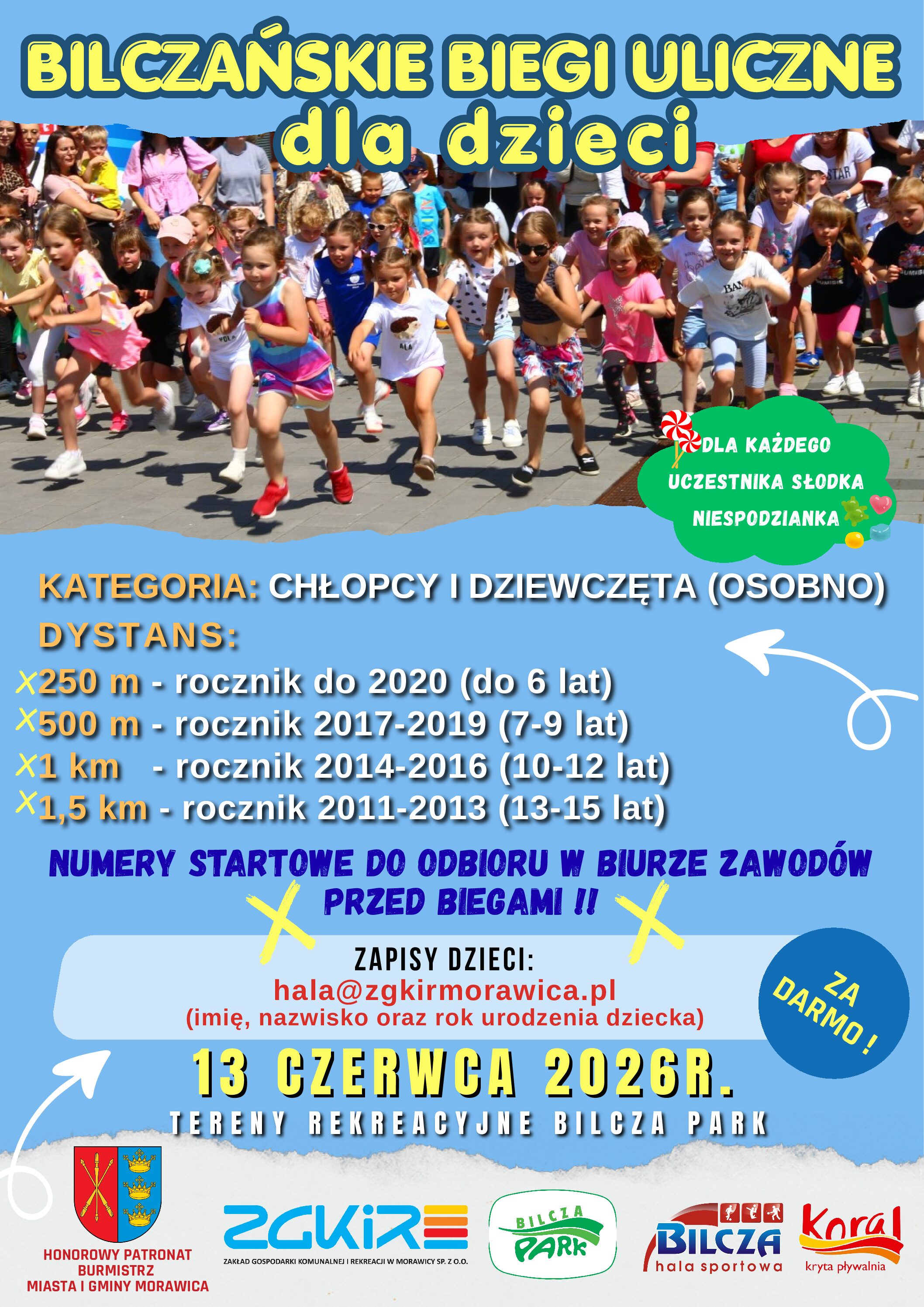 ZAPISY NA BILCZAŃSKIE BIEGI ULICZNE DLA DZIECI! Ruszyły zapisy dla najmłodszych Termin biegów: 13 czerwca 2026 r. Miejsce: tereny rekreacyjne Bilcza Park Kategoria chłopcy i dziewczęta (osobno) Dystans: 250m – rocznik do 2020 (do 6 lat) 500m – rocznik 2017-2019 (7-9lat) 1km – rocznik 2014-2016 (10-12lat) 1,5km – rocznik 2011-2013 (13-15lat) Udział w biegach jest […]
