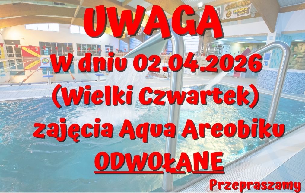 31/03/2026 - Kategoria Pływalnia KORAL Autor: Krystyna Basińska - Wielki Czwartek – zajęcia Aqua Areobiku – odwołane W dniu 02.04.2026r. (Wielki Czwartek) zajęcia Aqua Areobiku ODWOŁANE Poprzedni Ogłoszenie o sprzedaży – kosiarki ciągnikowej Vottex RM 1202 z 2018 roku Następny Życzenia Świąteczne